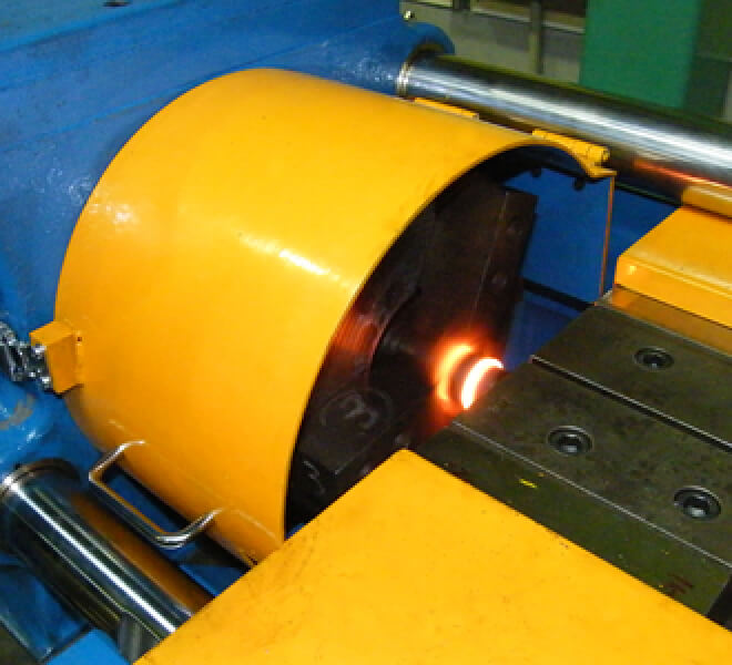 金属の摩擦で発生する熱エネルギーと圧力を利用した、摩擦圧接。 スピーディに圧接ができますので、材質におよぼす熱の影響が少なく、母材と同様の機械的性質が得られます。
